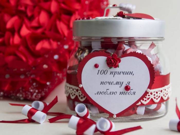 Упаковать 100 причин можно в баночку, которую оформляют в любой технике. Эффектно смотрится декупаж, роспись или простой декор лентами.
